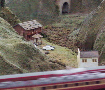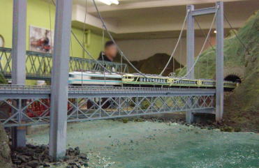 左)吊り橋:山岳線にかかる近代的吊り橋はオーナーの手作り。「なのはな」が轟然と通過する。