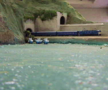 右)日本海の凪:海上より線路を望む。新ナカニの58が牽く信越線停客のイメージ。